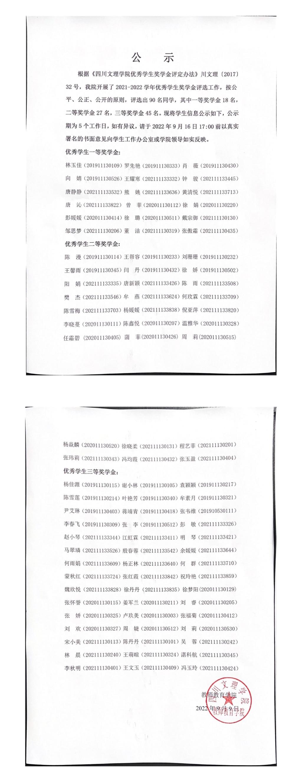 bat365正版唯一官网2021-2022学年度优秀学生奖学金公示通知