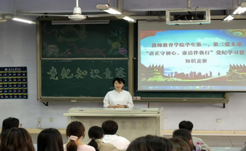 为深入学习贯彻《中国共产党纪律处分条例》,教育引导广大党员同志自觉主动学纪、知纪、明纪、守纪,全面落实从严治党要求,努力把纪律规矩转化为政治自觉、思想自觉、行动自觉,2024年6月5日,bat365正版唯一官网学生第一、第二党支部在博文楼215教室开展“清正守初心、廉洁伴我行”党纪学习教育知识竞赛活动。本次活动采取集中线上答题形式,学生第一、第二党支部全体党员参加。党委副书记王文娟主持本次活动。