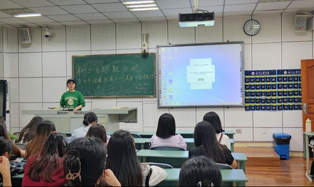 各团支部通过政策宣讲、故事分享、互动等形式,深入讨论当前的就业形势,了解就业市场的现状和未来趋势,引导学生树立正确的就业观念和职业规划意识,关注市场需求,提升自身技能。同时,各团支部通过朗读、问答等形式,以“绿水青山就是金山银山”为切入点,深入了解和贯彻习近平生态文明思想,积极投身美丽中国建设,以青春行动助力全面推进人与自然和谐共生的现代化。