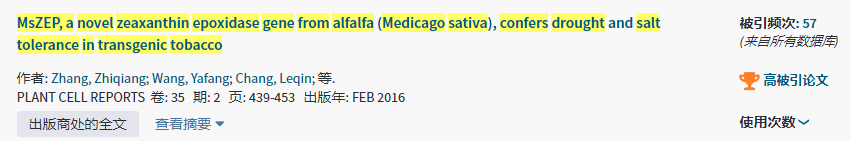 本篇高被引论文题目为《MsZEP,a novel zeaxanthin epoxidase gene from alfalfa (Medicago sativa),confers drought and salt tolerance in transgenic tobacco》,2016年发表在期刊《PLANT CELL REPORTS》,论文主要研究了来自紫花苜蓿的新型玉米黄质环氧酶基因MsZEP在转基因烟草中的表达特征和生物学功能。该论文累计被引用57次,为我校草学学科进入ESI全球前1%行列做出了积极的贡献。